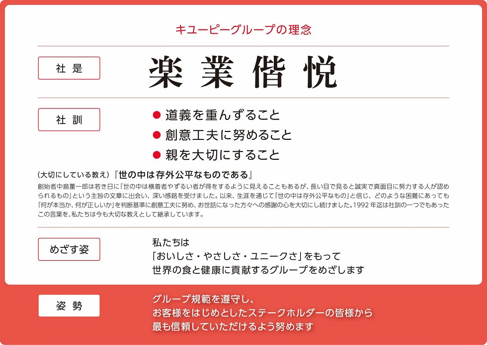 このように研究開発、生産、販売の部門が協力をして、キユーピーの創始者である中島董一郎の「食を通じて社会に貢献する」という精神で、卵の魅力を世界へ広げるリーディングカンパニーをめざしています。